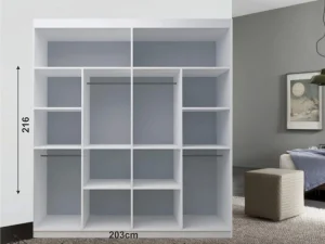 is a Beautiful 2 and 3 door mirror sliding wardrobe with LED LIGHT. It has plenty of space for hanging and shelves. Brand new design with elegant matte finish with different colors and sizes. MILAN Wardrobe introduces a new dimension to this popular sliding door wardrobe range, thanks to its glittering polished chrome handles and trims, which really stand out against both light and dark finish options.