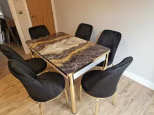 £460.00Original price was: £460.00.£360.00Current price is: £360.00.ROYAL MERMER BLACK WOODEN EXTENDABLE DINING TABLE WITH 6 VELVET CHAIRS