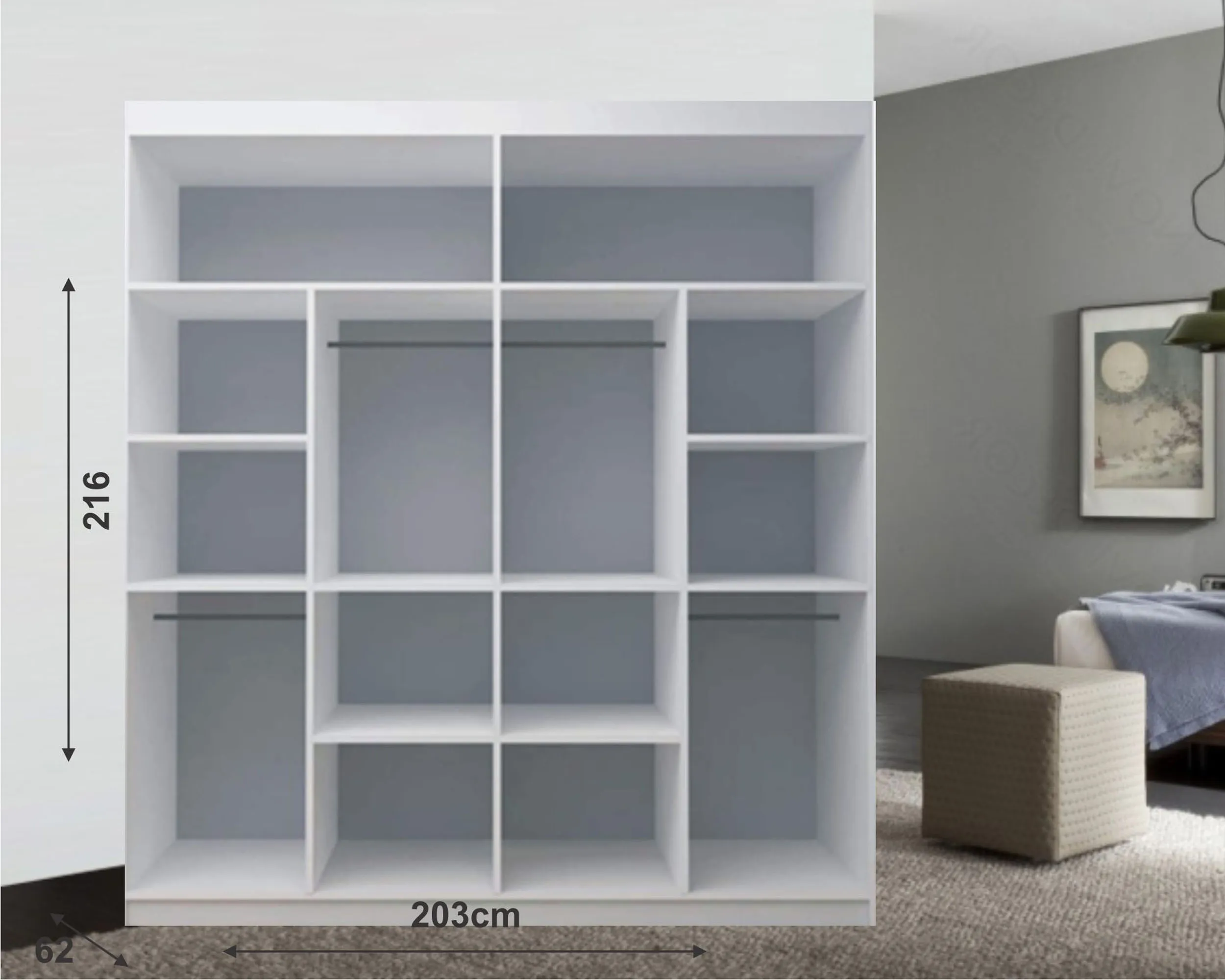 is a Beautiful 2 and 3 door mirror sliding wardrobe with LED LIGHT. It has plenty of space for hanging and shelves. Brand new design with elegant matte finish with different colors and sizes. MILAN Wardrobe introduces a new dimension to this popular sliding door wardrobe range, thanks to its glittering polished chrome handles and trims, which really stand out against both light and dark finish options.