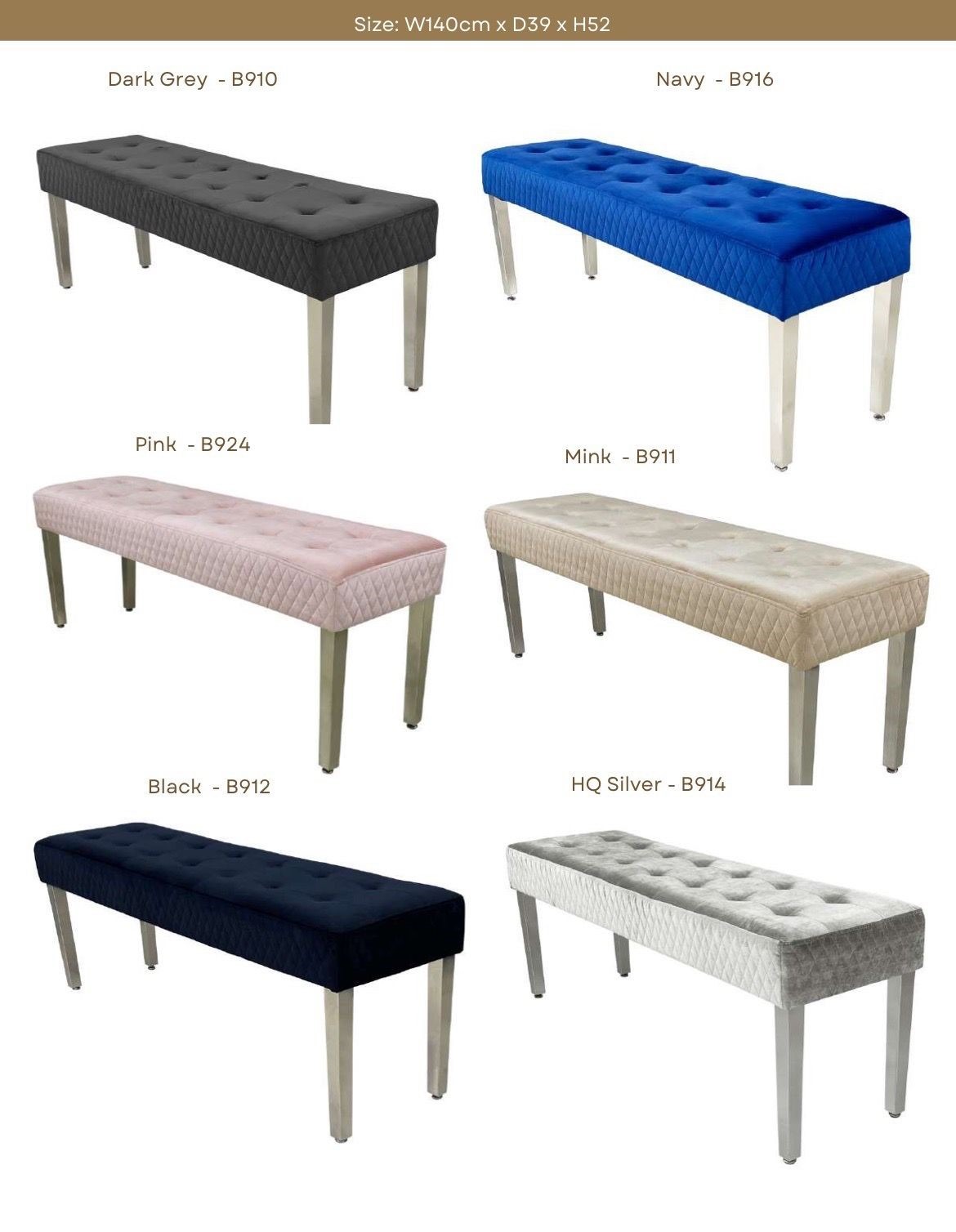 Upholstered in luxury plush velvet fabric with a quilted seating area and sides, the Madrid bench fits perfectly with any table 1.6m and up, finished with chrome legs.