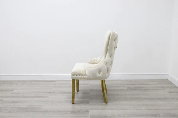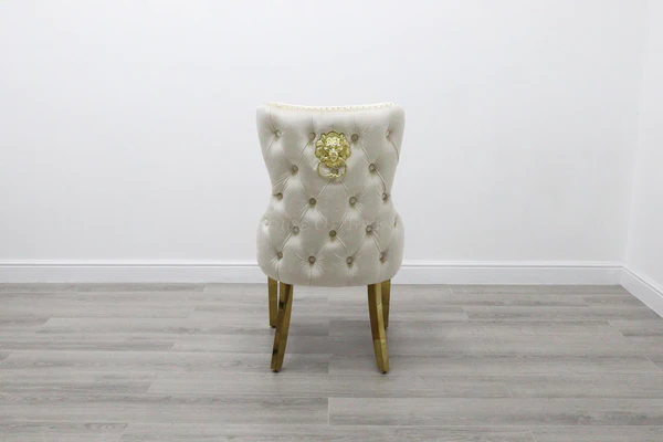 Upholstered in luxury plush velvet fabric with a quilted scooped back and hand-buttoned front, the Vienna dining chair Is not only made for comfort but is also highly stylish. Featuring a lion knocker back or ring back, gold studding trim, and gold legs.